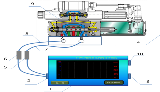 1、在線判斷液壓控制閥設備故障;在現(xiàn)代化的生產(chǎn)線包含有液壓控制閥的設備一旦出現(xiàn)故障,普通員工很難判斷是機械故障、液壓故障還是電氣控制故障;該儀器可解決上述問題,一步,斷開與液壓控制閥相連的電氣插頭,把本儀器配套的插頭插上,二步,將壓力傳感器的兩根測壓線連接到液壓控制閥的A、B口測壓點上,三步,打開本儀器電源,選擇與液壓控制閥相對應的信號,手動測試即可判斷是機械故障、液壓故障還是電氣控制故障;如下圖: