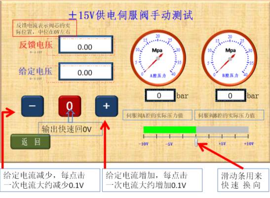 6、比例閥正常時(shí)的表現(xiàn)為:a、給定電流12.00ma時(shí),反饋電流在12.00ma,比例閥輸出的A、B腔壓力相同;b、用滑動(dòng)條可迅速換向,反饋電流改變且A、B腔壓力差較大;c、點(diǎn)擊增加按鈕,反饋電流逐漸增加且A、B腔壓力差逐漸增大;d、點(diǎn)擊減少按鈕,反饋電流逐漸減少且A、B腔壓力差逐漸減少,過12.00ma后比例閥會(huì)換向;