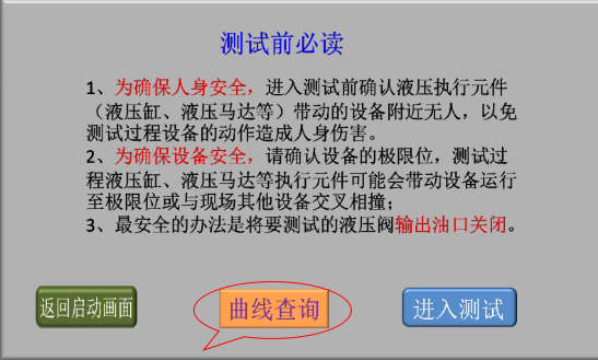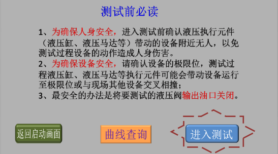 3、確認(rèn)現(xiàn)場(chǎng)人員和設(shè)備安全后,點(diǎn)擊“進(jìn)入測(cè)試”,進(jìn)入液壓閥測(cè)試類(lèi)型選擇畫(huà)面;