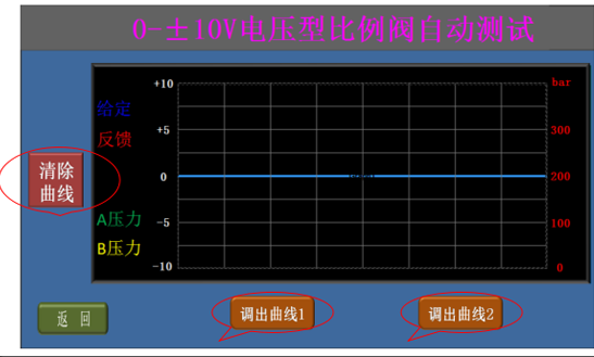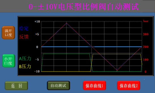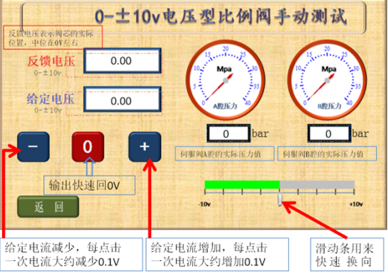 6、比例閥正常時(shí)的表現(xiàn)為:a、給定電流OV時(shí),反饋電流在0V,比例閥輸出的A、B腔壓力相同;b、用滑動(dòng)條可迅速換向,反饋電流改變且A、B腔壓力差較大;c、點(diǎn)擊增加按鈕,反饋電流逐漸增加且A、B腔壓力差逐漸增大;d、點(diǎn)擊減少按鈕,反饋電流逐漸減少且A、B腔壓力差逐漸減少,過(guò)0V后比例閥會(huì)換向;
