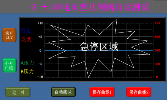* 選擇小開(kāi)口度后點(diǎn)擊“自動(dòng)測(cè)試”可使比例閥從0開(kāi)口度逐漸增加到+20%開(kāi)口度,再逐漸減少到-20%,然后逐漸增加到0開(kāi)口度;